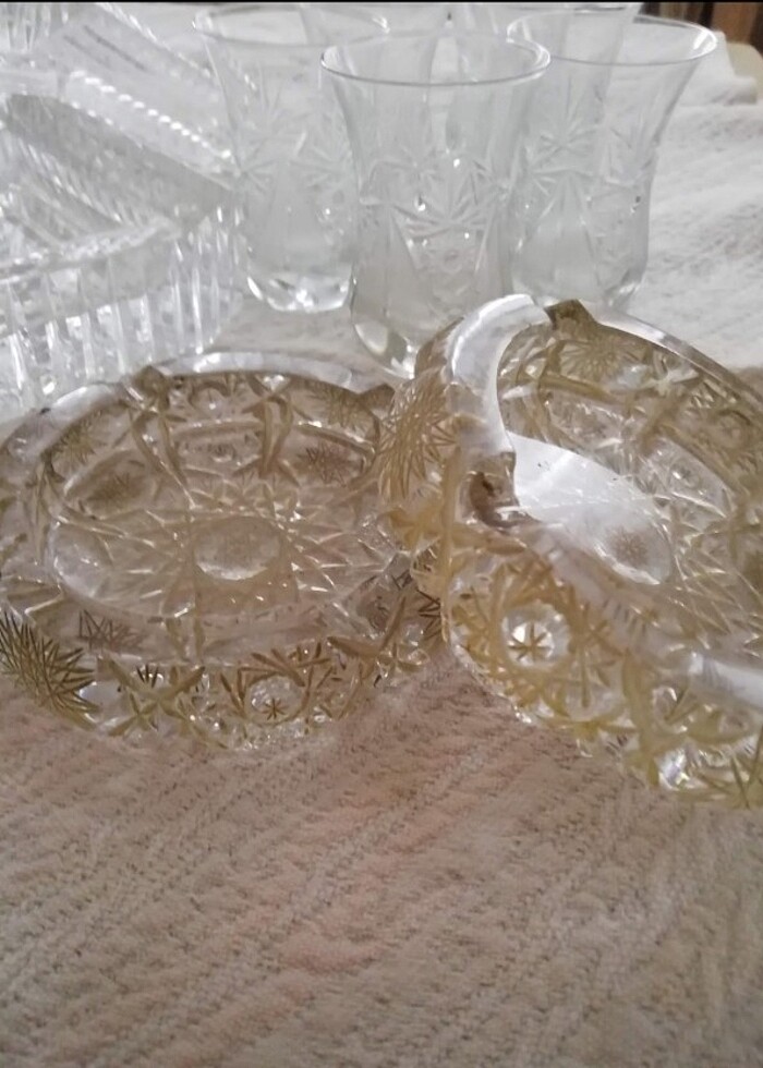 Kristal 18 parça çeşitli bardak, küllük, sigaralık. Sigaralığın üstünde ufak bir çatlak var.