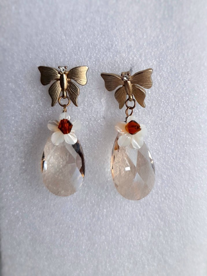 Kelebek detaylı, sedef mine çiçekli, damla kristal taşlı sallantılı küpe, Çok şıktır. Tertemizdir. Kusursuzdur. Hiç kullanılmadı. Yaklaşık 20 yıl önce Couqet mağazasından alındı. Kaliteli bir üründür. Ölçü uzunluk 3.50 cm dir.