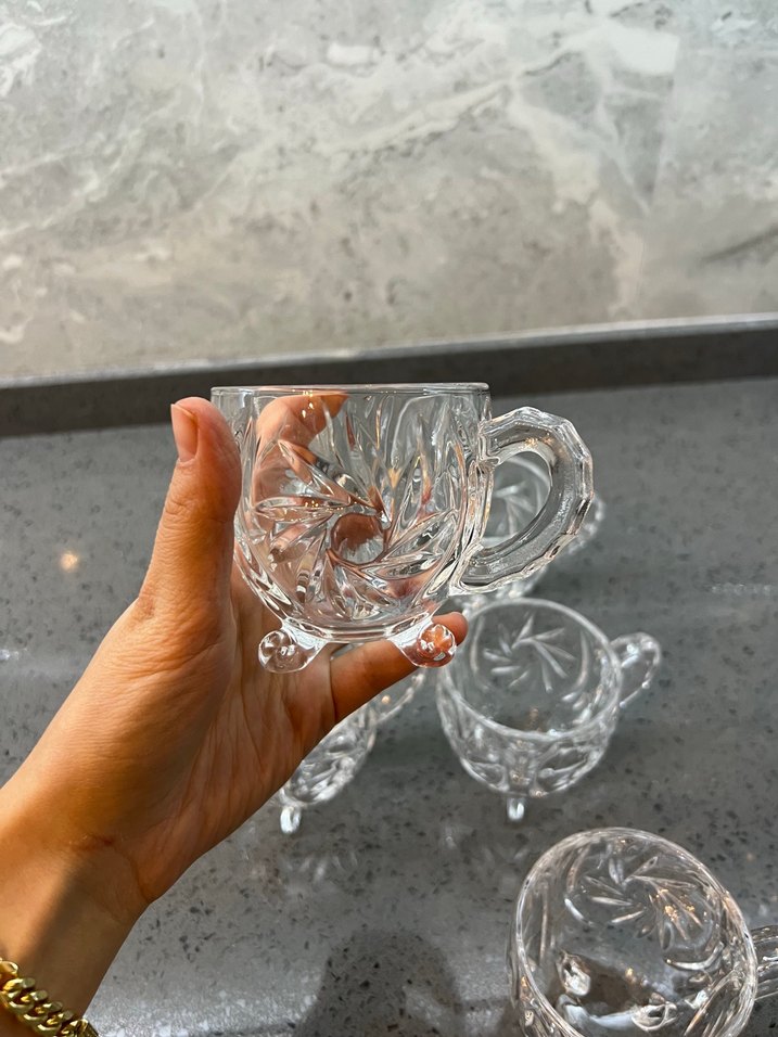 Detaylı yıldız desenli ve özel saplı şeffaf cam kupa, içeceklerinize şıklık katar. Sıcak veya soğuk içecekler için uygundur. ☕ 6 adettir çizik hasar yoktur