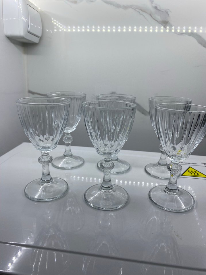 Altı parça, kristal görünümlü cam kadeh seti, içecek sunumları için ideal.