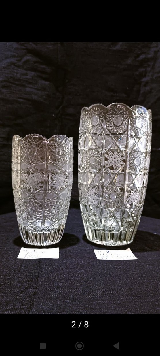 2 adet Paşabahçe tertemiz hiç yıpranmamış 17 cm ve 22 cm yüksekliginde kalın kesimli ağır ürünlerdendir. Sadece salon vitrininde görsel sağlanmıs olup kullanılmamıstır. Şimdiki ince camlı kristal lerle kıyaslamayınız ki adet beyaz işlemeli kristal vazo seti, detaylı desenlere sahip ve koyu arka planla öne çıkıyor. Dekoratif kullanım için uygun.