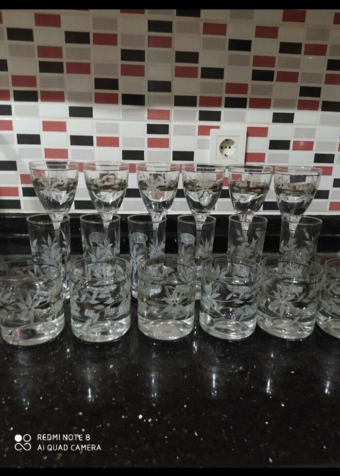 18 parça taşlı varaklı kristal takim hiç kullanilmadi sıfır ayarında sadece yıkayıp kaldırdığında 3 rakı bardaginin yanındaki taslarda düşme var kullanıma engel kırık çatlak hiçbir sorun yok
