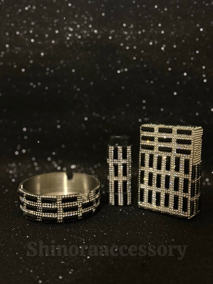 Kristal parlak taşlı Baget tasarım sigara kutusu çakmak küllük 3’lü set