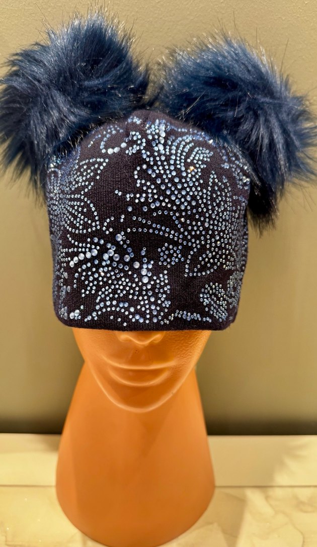 Koyu mavi renkli, çift peluş ponponlu detaylı ve parlak desenlere sahip kadın bere. Cesur avangard gotik tarzı içerir.