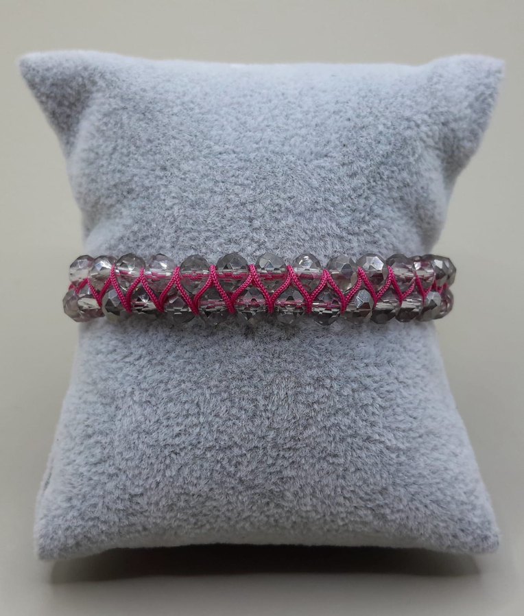 Pembe renkte, nakış detaylı, renkli boncuklarla süslenmiş bohem tarzda kadın bileklik. Ayarlanabilir tasarımı ve şeffaf boncuklarıyla günlük kullanıma uygundur.