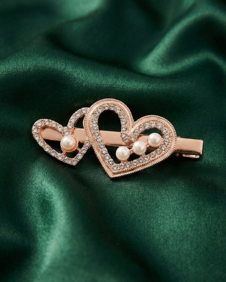 Kristal Taşlı, İncili İkili Kalp Metal Mandal Rose Gold Toka