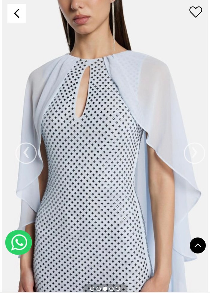 Uzun bebe mavisi elbise, pelerin ve kristal taş detayları ile öne çıkar. Kayık yaka ve ince askılı, düzenli kesim, modern ve avangart tarzda. Şal ve bone ise takılır
