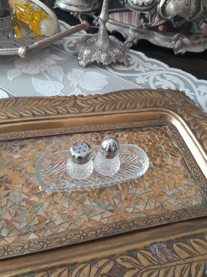 Kristal tuzluk ve biberlik seti, şeffaf tepside ve süslü altın tonlarında tepsi üzerinde yer alıyor. Üstleri delikli gümüş kapaklı.
