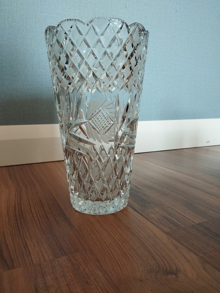 Kristal kesim desenlere sahip şeffaf ve uzun vazo. Çiçek sergilemek için uygundur.