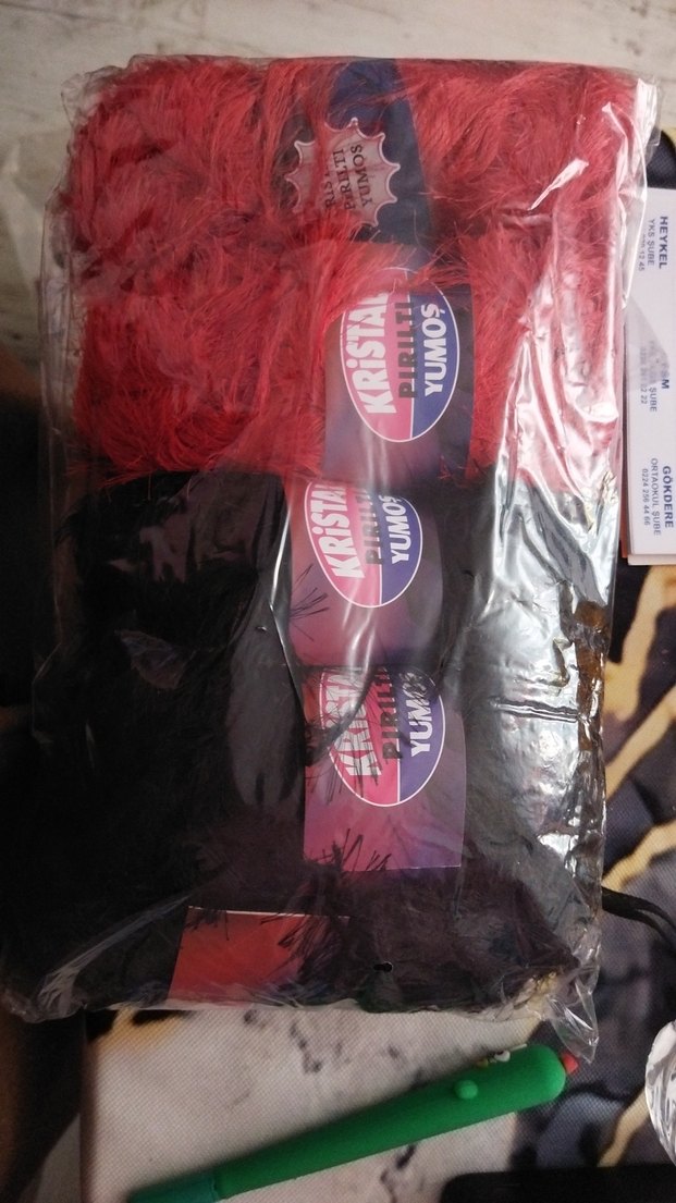 Kristal Yumak markalı kırmızı ve siyah tiftik iplik seti, çeşitli el işi projeleri için uygundur.