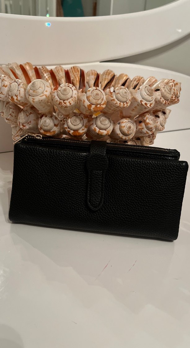 Siyah deriden yapılmış tokalı kadın cüzdanı, desen içermeyen yüzeyiyle günlük kullanıma uygun modern Paris tarzını yansıtıyor.