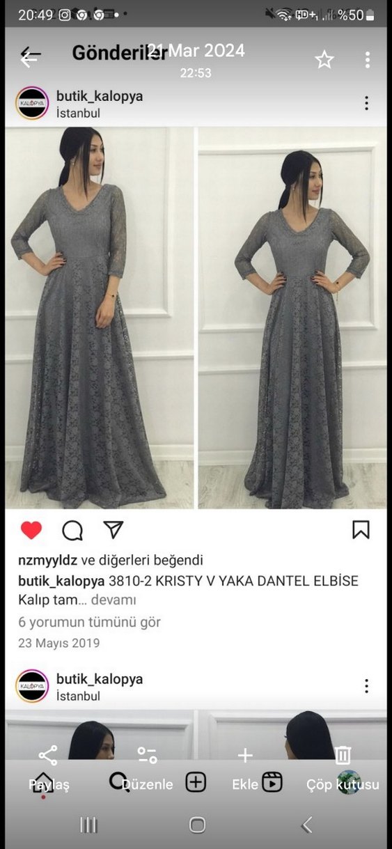 Gri renkte, V yakalı ve dantelli uzun elbise. Modern klasik tarzda, düzenli kesim ve uzun kollu, düğünler için uygun.