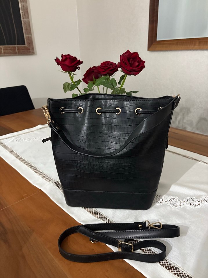 Krokodil desenli siyah deri çanta, tokalı detaylara sahip. Çıkarılabilir askısı var, gotik Paris tarzını yansıtır. Günlük kullanıma uygun.