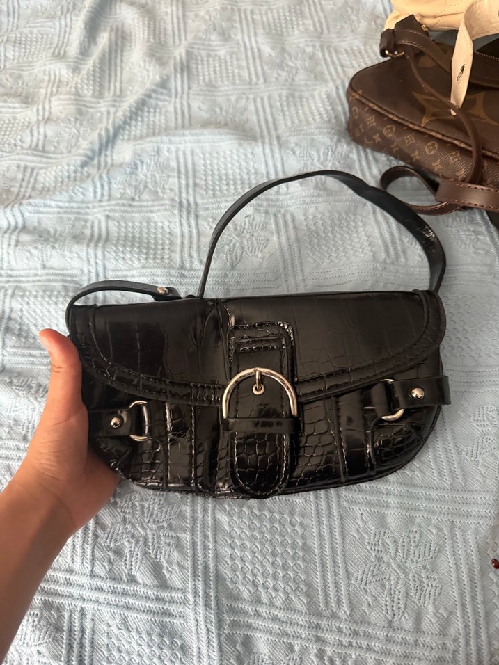 Krokodil desenli siyah deri kadın çantası, tokalı kapak detaylarıyla goth tarzını yansıtır. Günlük kullanıma uygundur.