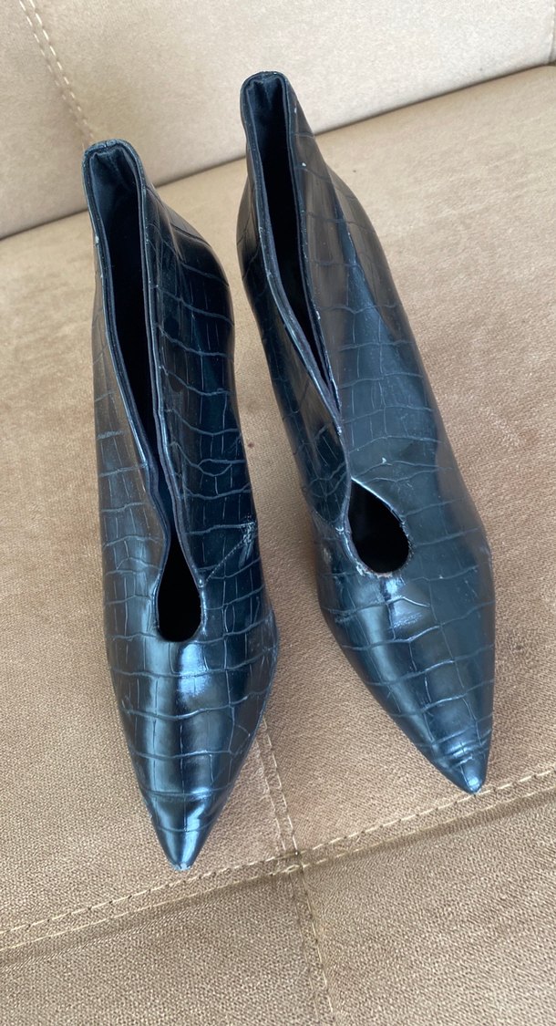 Krokodil desenli siyah deri stiletto botlar, tokalı detaylı, romantik akşamlar için uygun. Yıpranmalar var fotoda belirtildi