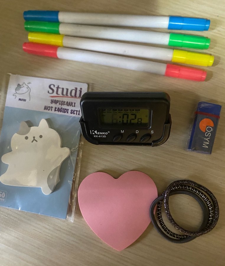 dijital zamanlayıcı, kalp ve kedi şekilli yapışkan notlar, renkli kalemler ile saç tokaları. hepsinin toplam fiyatıdır.