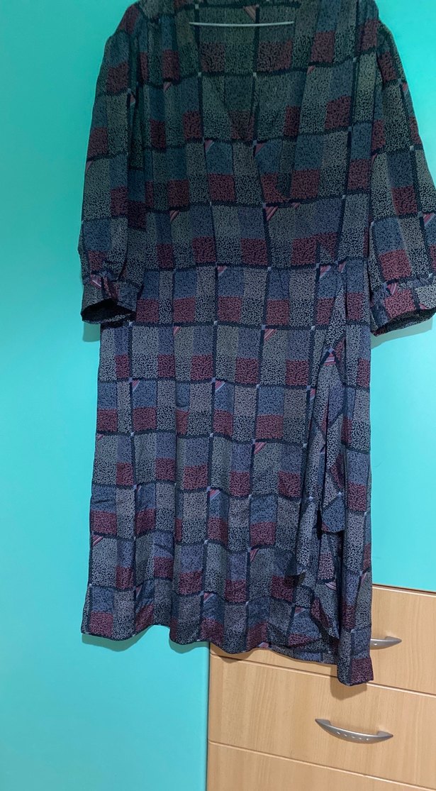 Bol kesim, çok renkli tie-dye desenli elbise.Drapeli tasarım, V yakalı ve yarım kollu, bohem vintage tarzında günlük kullanım için uygun.bel 50 boy 105