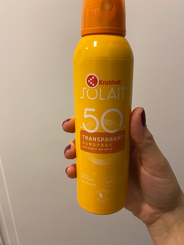 Kruidvat Solait SPF 50 transparan güneş spreyi, ciltte görünmez bir bitişle yüksek koruma sağlar. Suya dayanıklıdır ve UVA/UVB ışınlarına karşı korur.