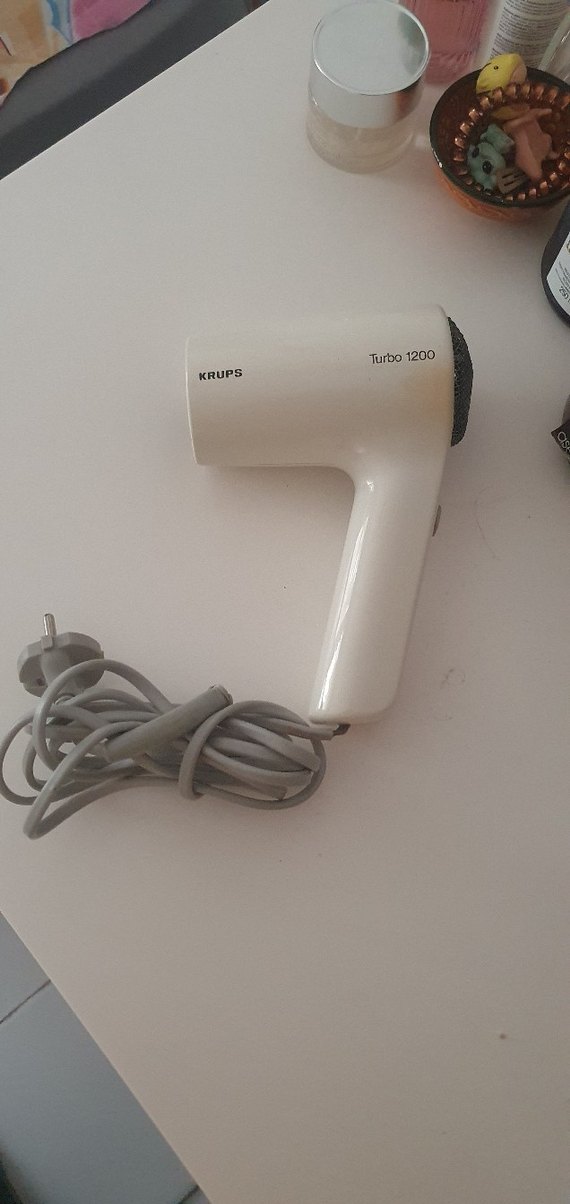 KRUPS Turbo 1200 saç kurutma makinesi beyaz renkte, kompakt tasarıma sahiptir.