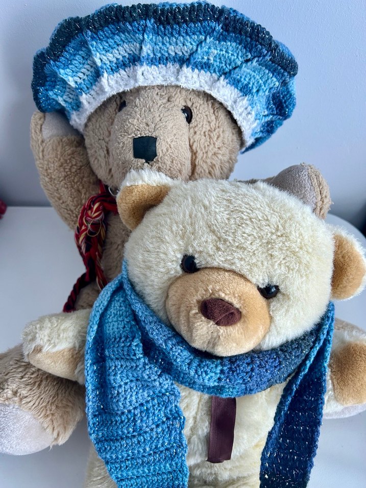 Papatya Batik Glitter ile örülmüş Kruvasan atkı ve ressam bere. İp yapısı %97 akrilik, %3 polyester. Çok yumuşak bir dokusu yok, akrilik yapısı sayesinde tüylenmez. Bere çapı 28 cm, atkı uzunluğu 115 cm.