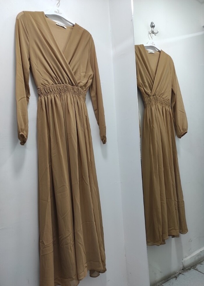Kruvaza Yaka Beli Lastikli Astarlı Şifon Elbise