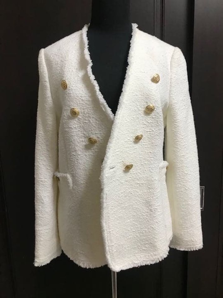 Beyaz, nakış kruvaze yakalı, uzun kollu, klasik kesim kadın blazer ceket. ✨