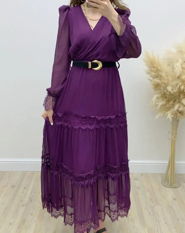 Kruvaze Kemerli Dantelli Şifon Elbise Mürdüm S Beden