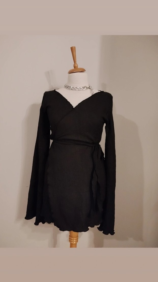Siyah triko kumaştan, kruvaze, V yakalı ve uzun kollu, mini boyda, düz ve dar kesim elbise. Gotik stil için uygundur. boy 75 cm'dir. likralı pamuklu kumaş.