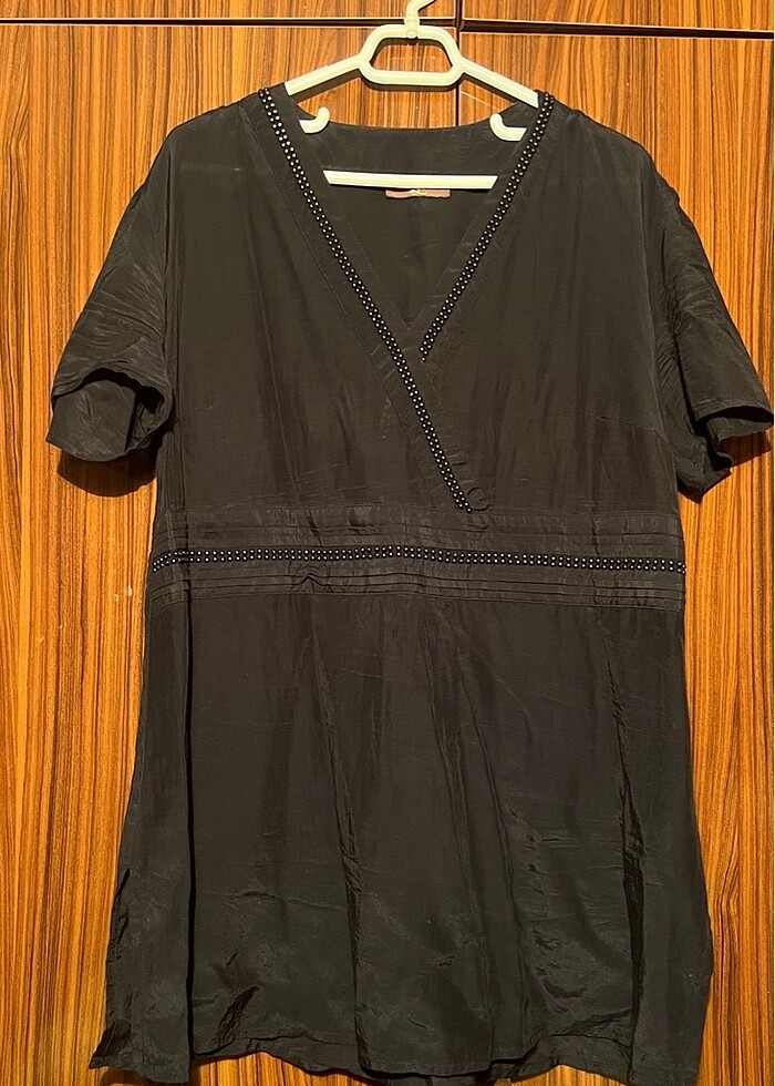 İncecik kumaşlı efil efil bir bluz. Boncuk detayları var bazı boncuklarda çok hafif soyulma var ama hiç belli olmuyor görseldeki gibi. Uzun ve bol bir yapısı var Çok giyilmedi. Adil ışık markalı kaliteli ve güzel bir kumaşı var