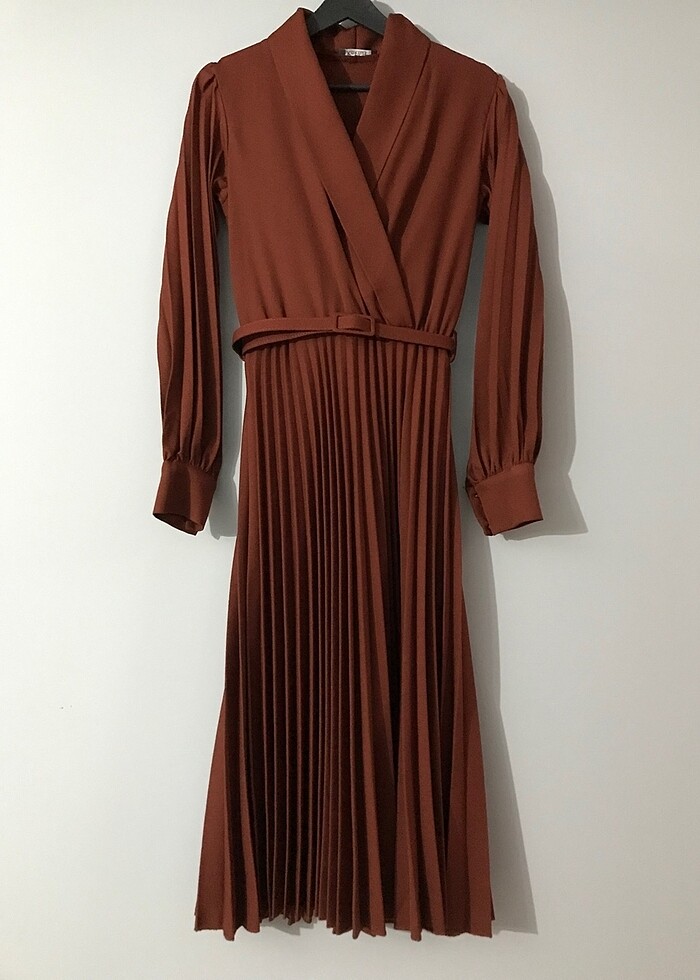 Kruvaze Yaka Eteği Pileli Kemerli Kiremit Elbise