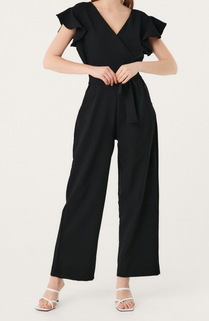 L beden kruvaze yaka kolları fırfırlı sırtı fermuar detaylı beli kuşaklı ve cepli siyah şık bi tulum. Ofis özel günler ve günlük kullanıma uygun siyah renktir.Sayfamda aynı tulumun saks mavi rengi de var. 1-2 kez giyildi sıfır ayarındadır.