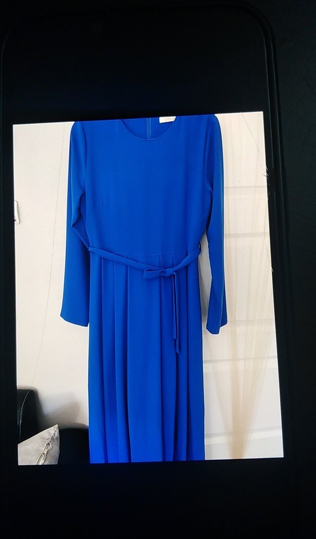 Kruvaze yaka ve uzun kollu, koyu mavi renkte uzun elbise. Kemerli ve regular fit kesimiyle modern klasik bir tarz sunar, ofis için uygundur.