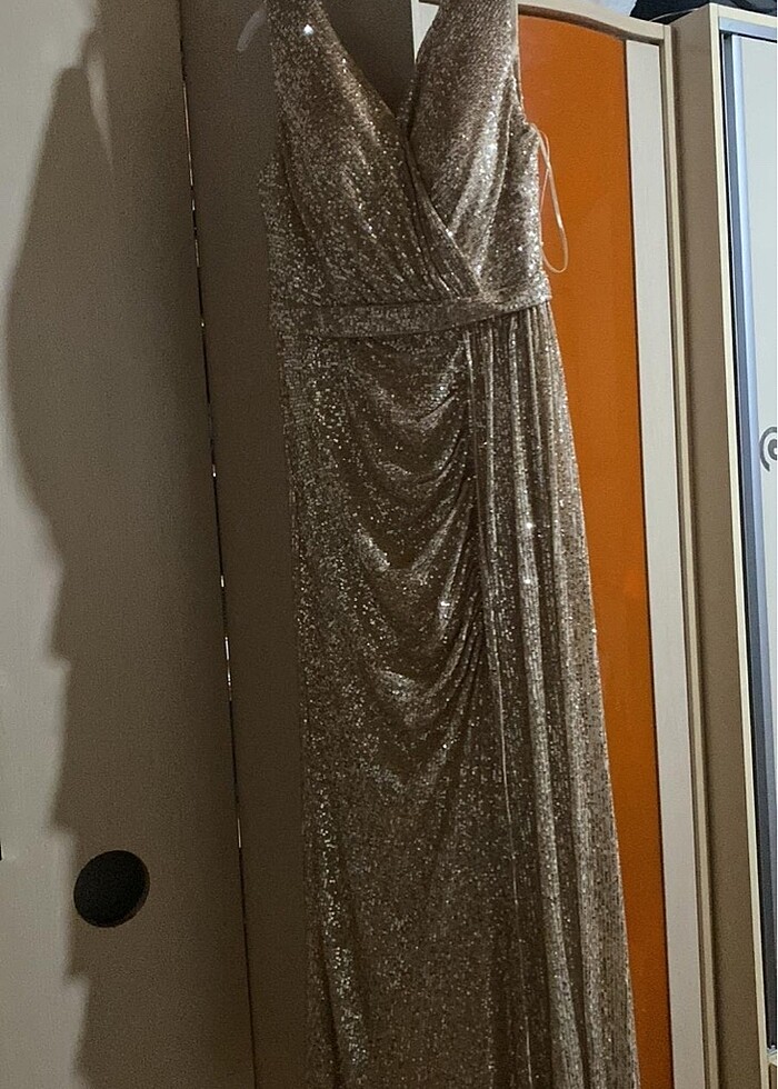 somon,vizon,gold karışık bir rengi var tam bilmiyorum bu rengin adını görselde ki gibi çok güzel ve rahat sadece 1 kere giydim düğünde elimde kalmasın diye satıyorum.. 40 beden ama daralttım yanlardan 38 olmuştur. bel ölçüsü:35 basen ölçüsü:40 elbise boyu:144