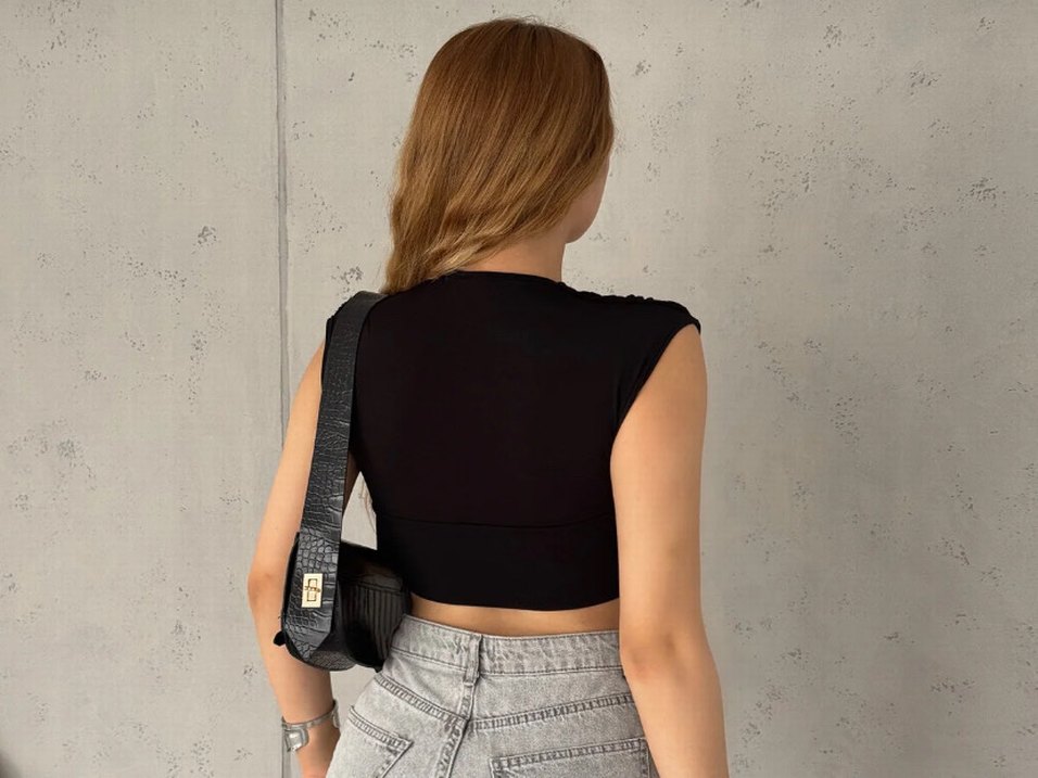 V yaka, kemerli, kısa kesim ve yılan desenli gri detaylı siyah deri kolsuz yelek, sokak stili için uygundur.