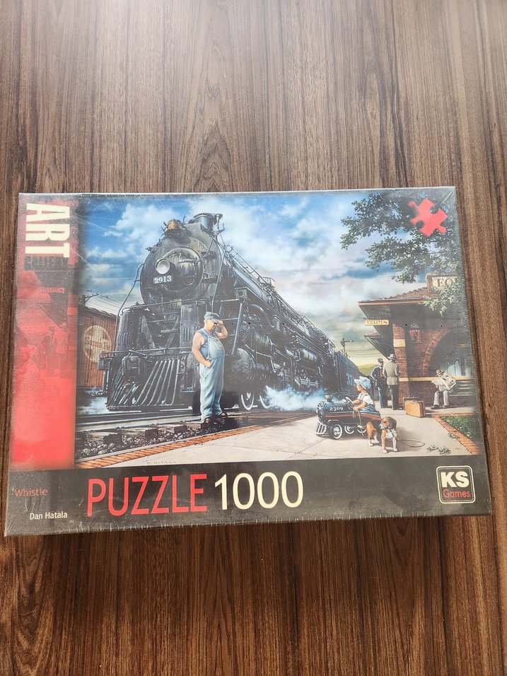 KS 1000 parçalı puzzle, siyah buharlı tren ve istasyonda çalışanları detaylı şekilde gösterir. Kutuda sanat eseri tasarımı bulunur.