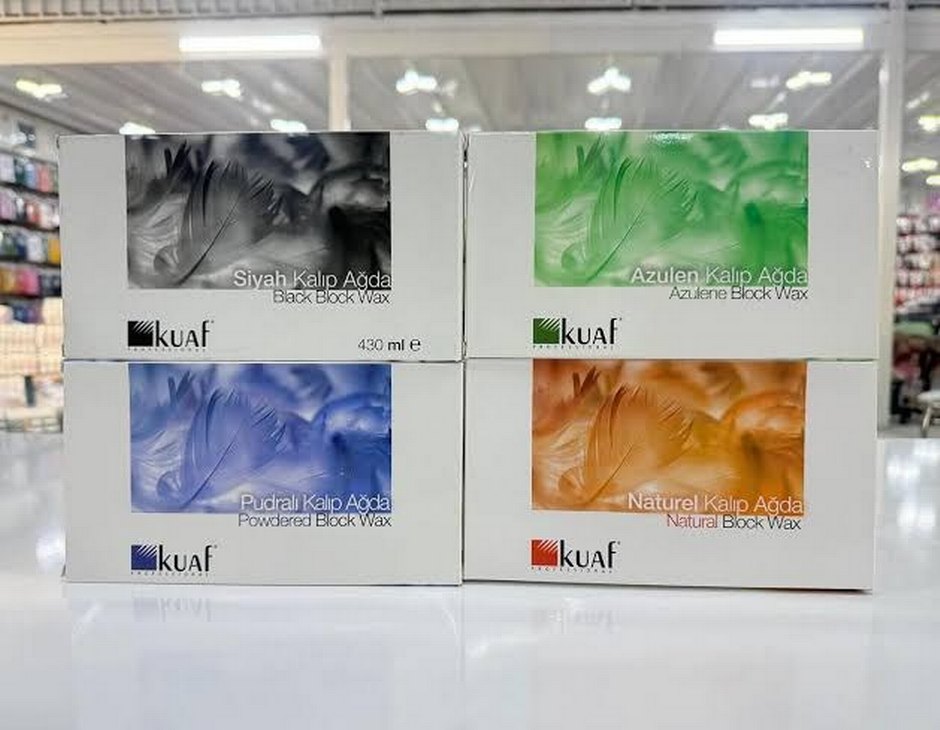 Kuaf kalıp ağda seti, siyah, pudralı, azulen ve naturel çeşitleriyle, her biri 430ml, farklı ağda ihtiyaçları için uygundur. ️