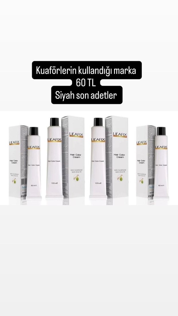 Kuaförlerin tercih ettiği siyah saç boyası, fiyatı 60 TL. Son stoklar mevcuttur. Markalar: TAIX, LEAFIX, LKASIX.