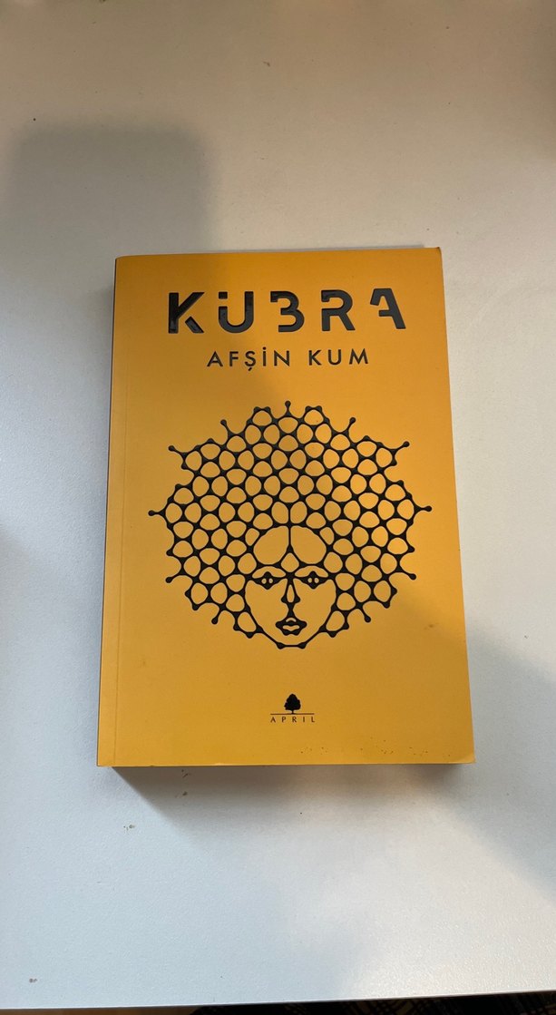 Afşin Kum'un yazdığı Kübra romanı, stilize yüz ve petek deseni içeren dikkat çekici kapak tasarımına sahiptir.