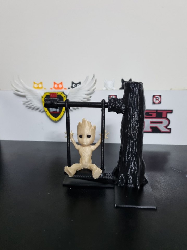 Küçük Bebek Groot, ağaç gövdesine bağlı salıncakta oturuyor. Koyu renkli ve altın tonlarında detaylar içeriyor.