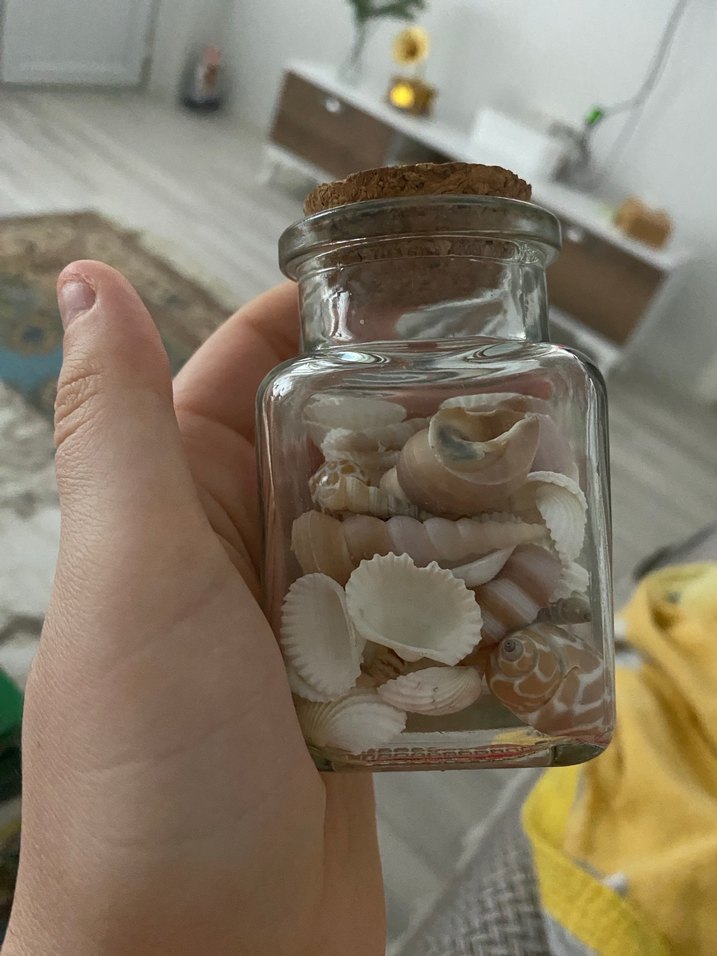 Küçük cam şişe, beyaz ve açık bej deniz kabuklarıyla dolu, mantar tıpa ile kapatılmış.