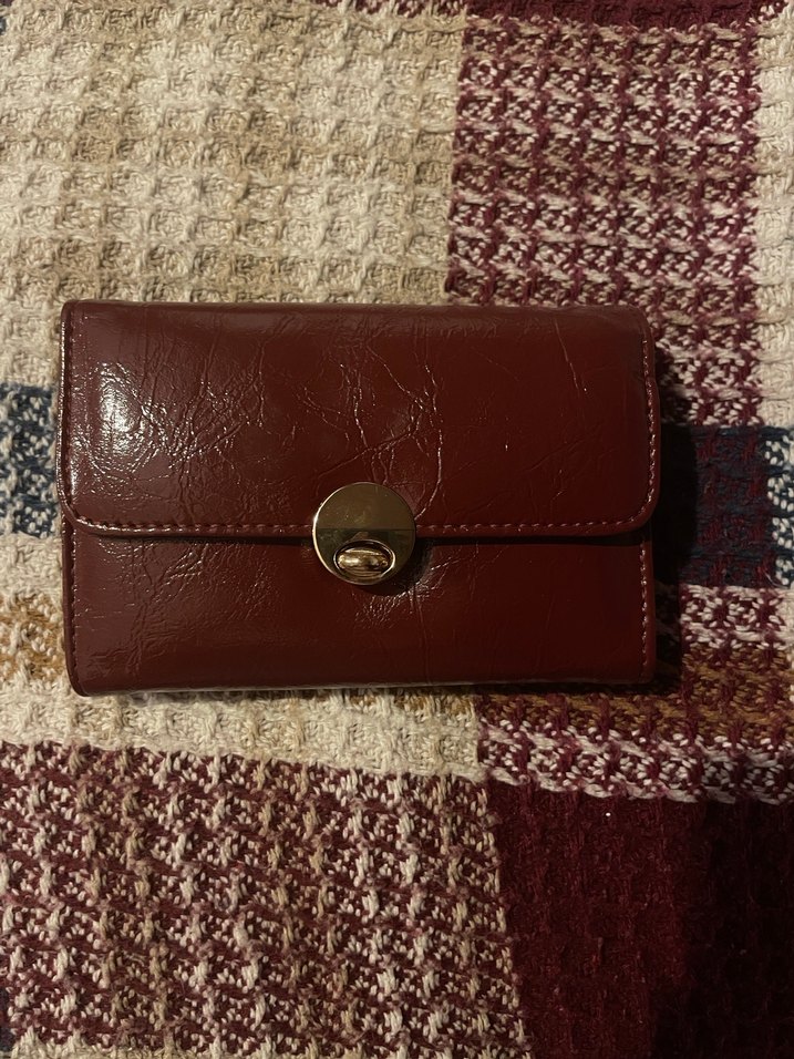 Kahverengi deri, tokalı kapanışa sahip vintage tarzda kadın portföy çanta. Günlük kullanım için uygun, koyu ve desensiz yüzeye sahiptir.