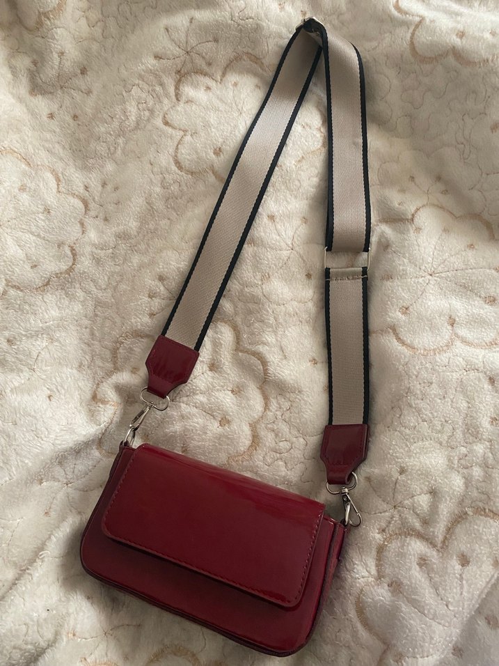 Kemer detaylı kırmızı deri kadın çantası, ayarlanabilir gri askısı ile günlük sokak modasına uygun. Hiç kullanılmadı