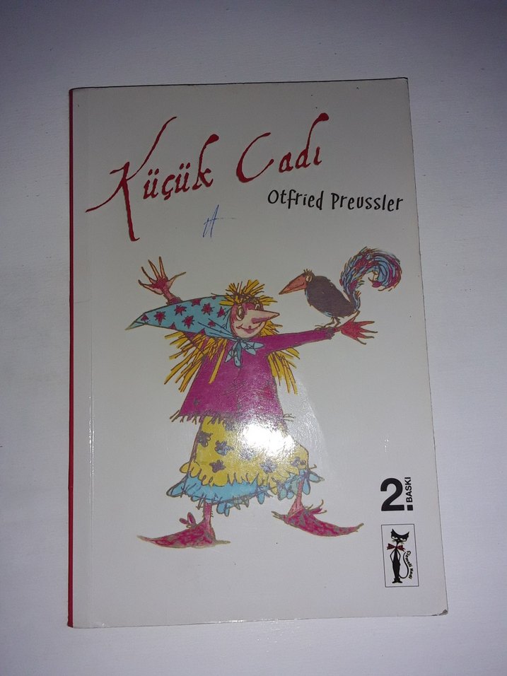 Otfried Preussler'in "Küçük Cadı" kitabı, küçük bir cadı karakterinin maceralarını anlatıyor. Kapakta renkli bir cadı ve elindeki kuş çizimi var.