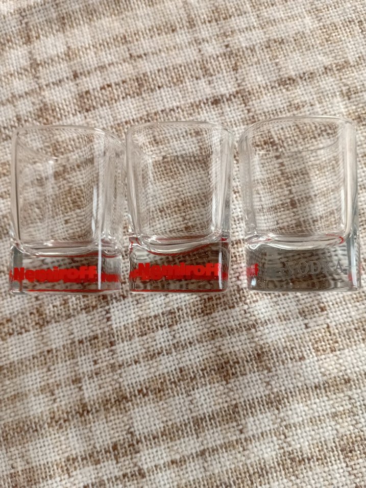 Altında kırmızı ve gri yazılar bulunan küçük şeffaf cam shot bardak seti.