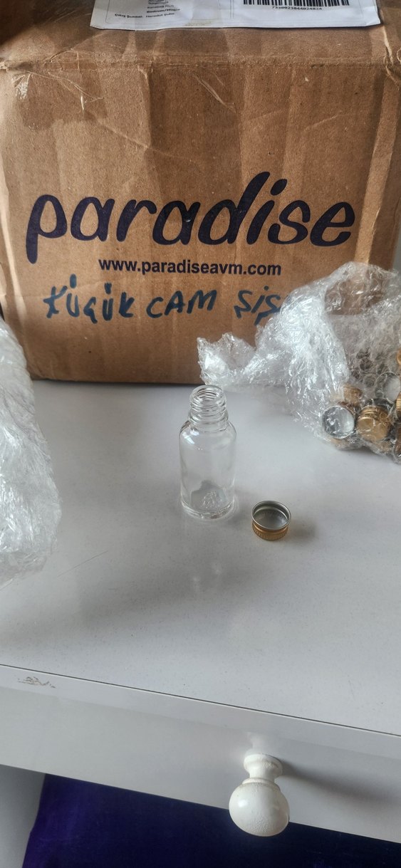 Bej renkte küçük camdan yapılmış. Metal kapaklı, şeffaf ve kullanımı kolaydır. Paradise markasına aittir. Süs için alındı kullanılmadı