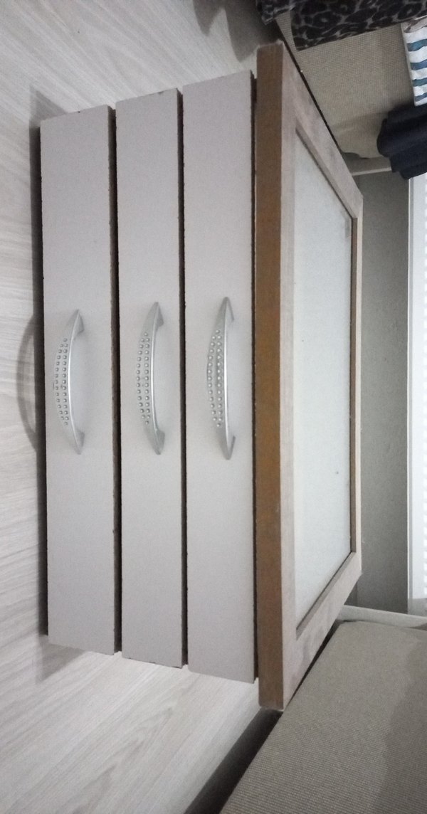 boyu 22 cm eni 47 cm küçük 3 adet çekmeli üst çekmecesi camlı dışarıdan görülebilir, çekmeceler yerinden çıkabilir.