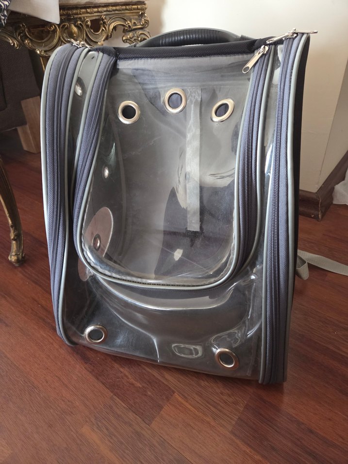 Havalandırma delikleri ve sağlam tutacağı olan gri şeffaf taşıma çantası, evcil hayvanlar için konforlu ve görünürlük sağlar.