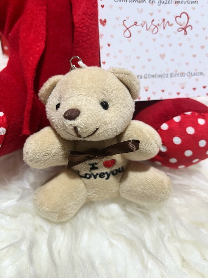 Yumuşak dokulu küçük kahverengi peluş ayıcık, boynunda kahverengi kurdele ve gövdesinde 'I ❤️ Love you' nakışı ile. Ayıcık anahtarlık