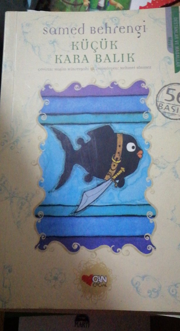 Küçük Kara Balık temalı, koyu mavi renkte çocuk kitap. Siyah balık ve kılıç figürü bulunur. Bazi yerlerde not alınmış