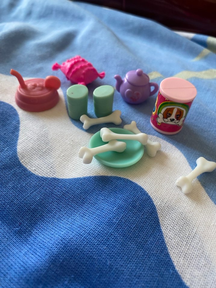 Pastel renklerde küçük oyuncak seti; pembe kase, yeşil bardaklar, mor çaydanlık, pet illüstrasyonlu pembe kutu ve beyaz kemik şeklinde parçalar içerir.
